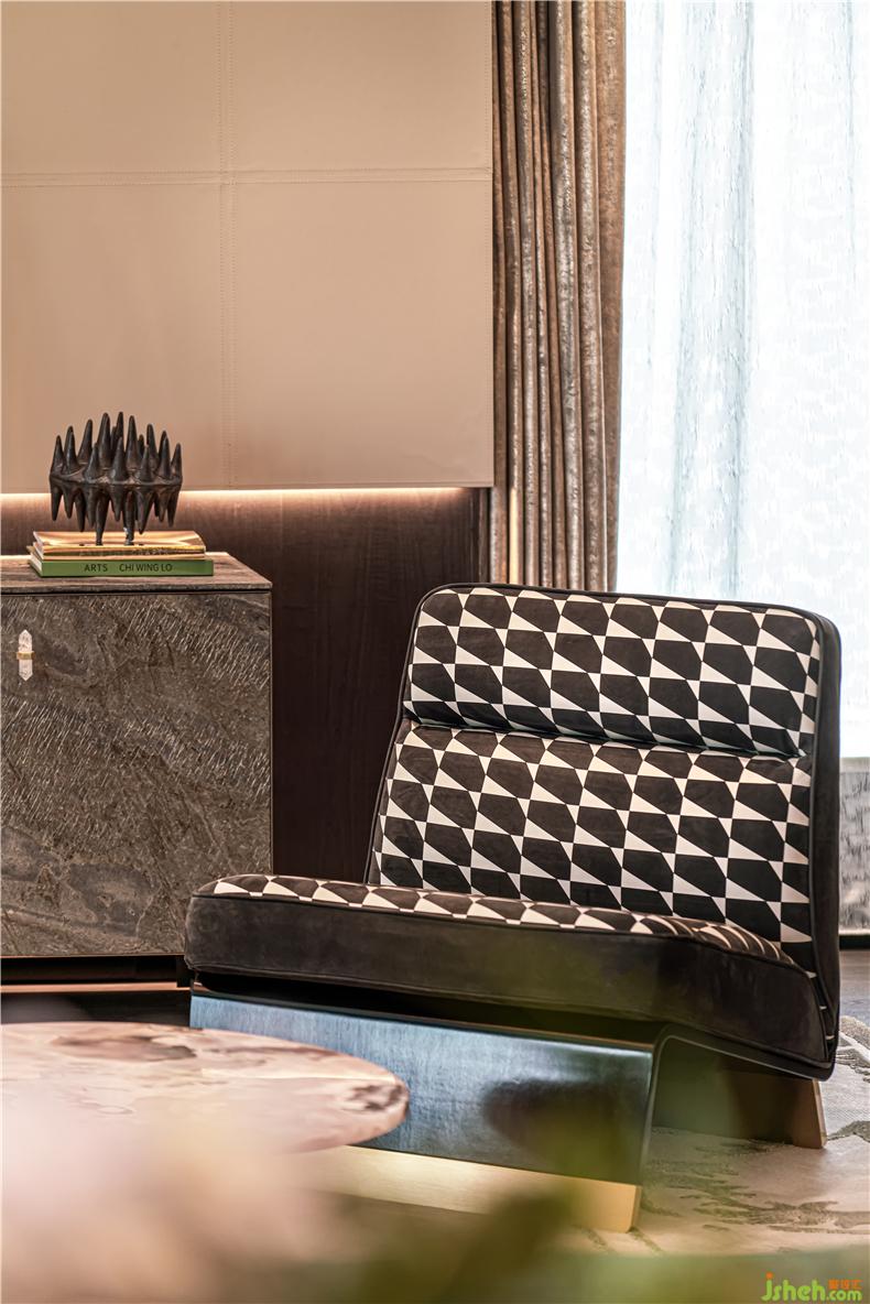 靠近電視墻的客廳角落,設(shè)置了一個(gè)Baxter的私人空間,主人回到家,光著腳踩在羊毛地毯上,樣板房設(shè)計(jì)可以舒服地坐在灰色格子紋沙發(fā)上,一杯咖啡一本書,書香人生?!昂苌偃藭?huì)用真的毛皮做地毯,純粹柔軟的觸感能給人以溫情的治愈力。