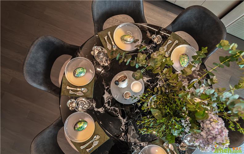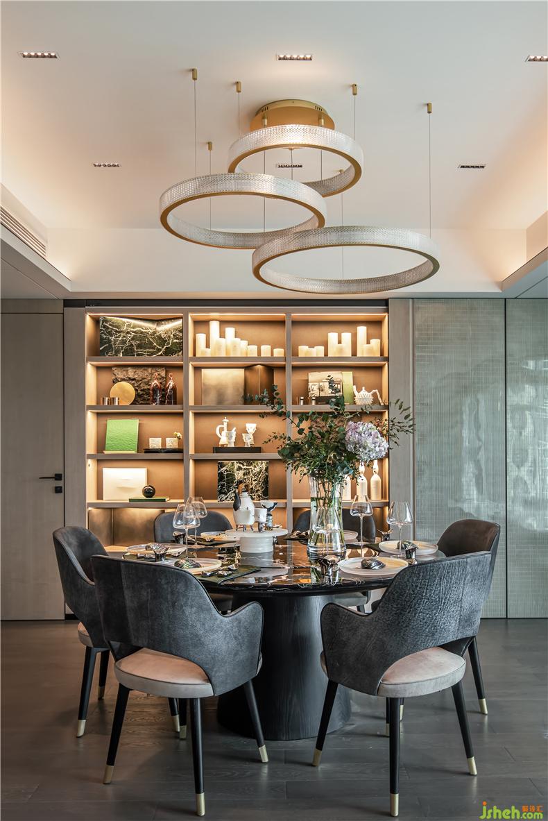 餐廳放置的大理石餐桌來自意大利高定,與藝術(shù)裝置背景墻相得益彰,餐椅選自意大利奢華家具新星HENGE,以當(dāng)代設(shè)計(jì)手法,帶來略帶復(fù)古時(shí)尚的奢華感,彰顯大家氣派.