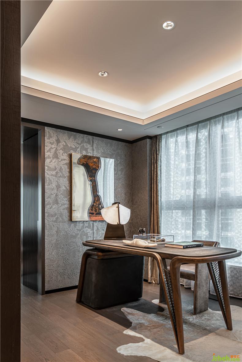 與書房相連的是床上用品、卷曲的壁紙和書房相同的顏色,順著貴族氣質(zhì)。室內(nèi)灰幕與墻紙同質(zhì)化回聲,金屬質(zhì)感造型獨(dú)特的燈具與灰色碰撞,冷感工業(yè)風(fēng)氛圍,擁有復(fù)古時(shí)尚的美感.