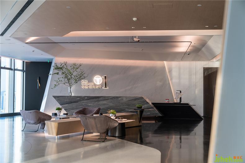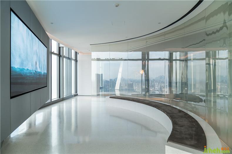 經(jīng)由接待前廳,先是進(jìn)入多媒體影音區(qū)。半圓型設(shè)計,線條簡潔,動線流暢,辦公室設(shè)計彰顯科技與時尚的設(shè)計感?;⌒尾Aγ娓舫霭雵鲜焦δ芊謪^(qū),內(nèi)外視野延伸,采光通透,還可以智能調(diào)節(jié)明暗,播放影音視頻時,玻璃墻會變成霧化磨砂質(zhì)地,增添空間私密性;弧形長條坐凳相得益彰,白色水磨石材基座與磨砂真皮坐墊組合,簡約之中不失型格氣質(zhì)。