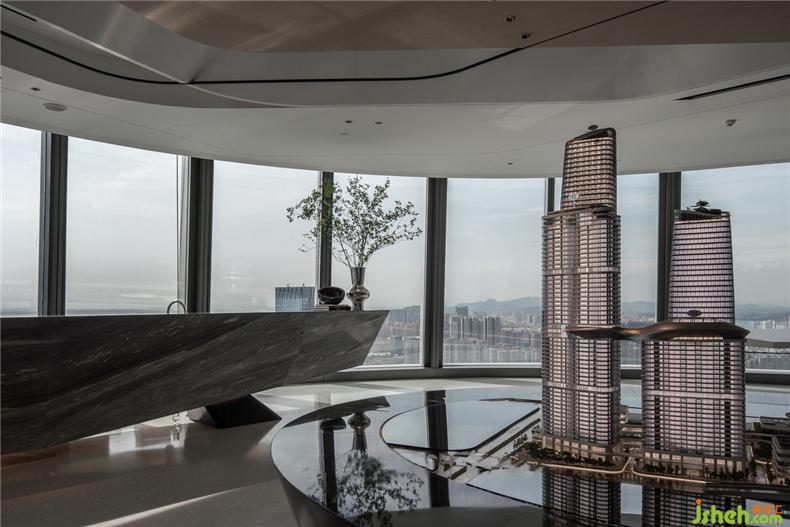 觀影結(jié)束,進(jìn)入項(xiàng)目沙盤展示區(qū)域,空間選材采用木紋鋁板與淺色水磨石墻面為主,辦公室設(shè)計深色石材基座造型簡約,建筑沙盤作為立體點(diǎn)綴成為了空間的焦點(diǎn)。