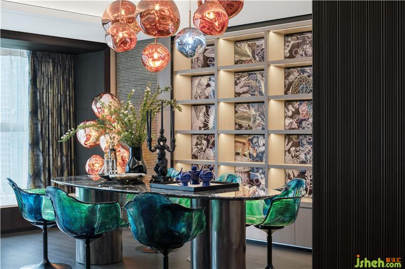 用餐區(qū)高度重視藝術表現(xiàn)方式,采用兼具裝飾性與趣味性的家具,樣板房設計營造前衛(wèi)的藝術用餐空間。Ella扶手椅、藝術餐桌、現(xiàn)代輕奢熔巖吊燈與熔巖落地燈共同優(yōu)雅了用餐空間。