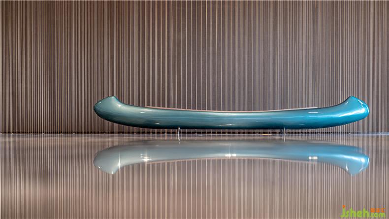 玻璃鋼噴色工藝,皮質(zhì)坐墊,與休息區(qū)的另一件藝術(shù)品黑色的船,同屬一個系列,一個是啟航之船,另一處黑色飛船,船面形式向下,為停泊之船,實用的功能皆為一條長凳辦公室設(shè)計。