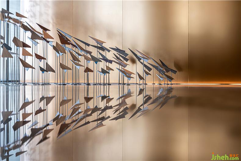 接待臺另一側(cè)的飛機主題裝置藝術(shù)《TAKE OFF起飛》,寓意了城市繁忙向上的商務精神。藝術(shù)品描繪的是深圳國際機場每天繁忙而有序的起落節(jié)奏,為這個國際大都會帶來繁榮的商務往來,欣欣向榮的深圳國際大都會,每一天都在發(fā)生新的變化。