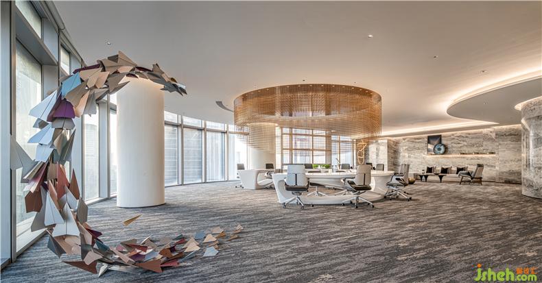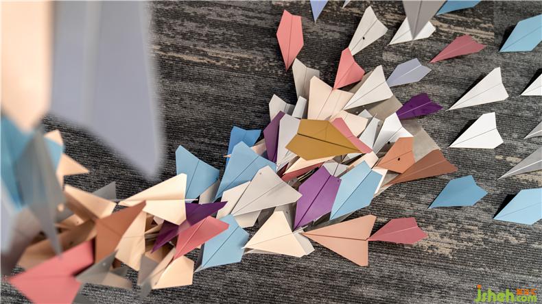 同系列另一組飛機主題裝置藝術(shù),放置在開放辦公區(qū),色彩呈現(xiàn)更加豐富,造型呈以彎月之勢,眾多架紙飛機自地面向上聚攏而起,寓義“九層之臺,起于壘土”,每一步的努力都是向上的階梯。