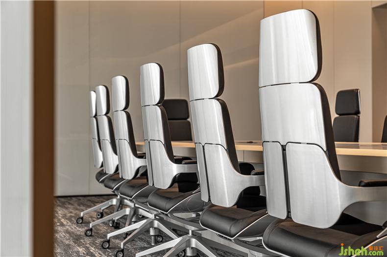改變傳統(tǒng)的辦公空間布局,開放式辦公展示區(qū)以圓形空間主導,白色玻璃鋼材質(zhì)的圓桌,以及銀色德國制造鋼板手扶辦公椅,造型前衛(wèi),充滿未來感,頂部螺旋狀弧形金屬罩造型,宛如宇宙星云環(huán)繞,與弧形辦公桌上下呼應,如太空艙主控臺一般,形成一個聚合能量場。