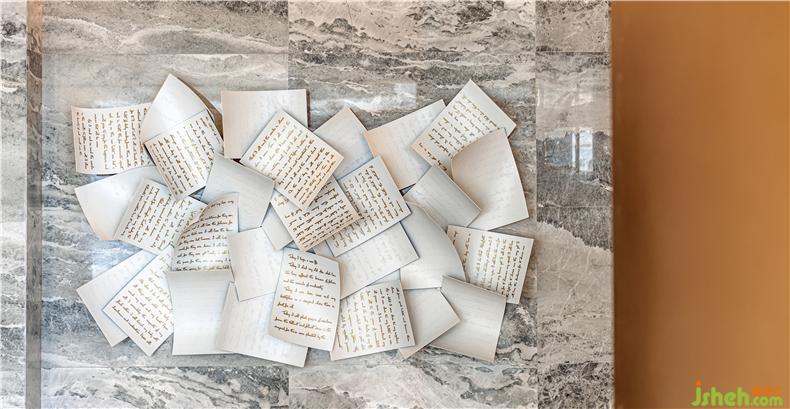 會議室與影音室一側(cè)的墻面上,設計師放置了一組辦公便簽/文件主題的金屬材質(zhì)藝術(shù)掛飾。畫面為一組寫著字跡的紙張,像被風吹過散落一地的感覺,又像是辦公室頭腦風暴留下的文件,飛揚起來被定格的一幕,辦公室設計藝術(shù)家將其融入藝術(shù)創(chuàng)作,再現(xiàn)工作氛圍中當下的永恒瞬間。