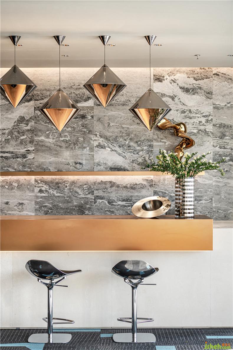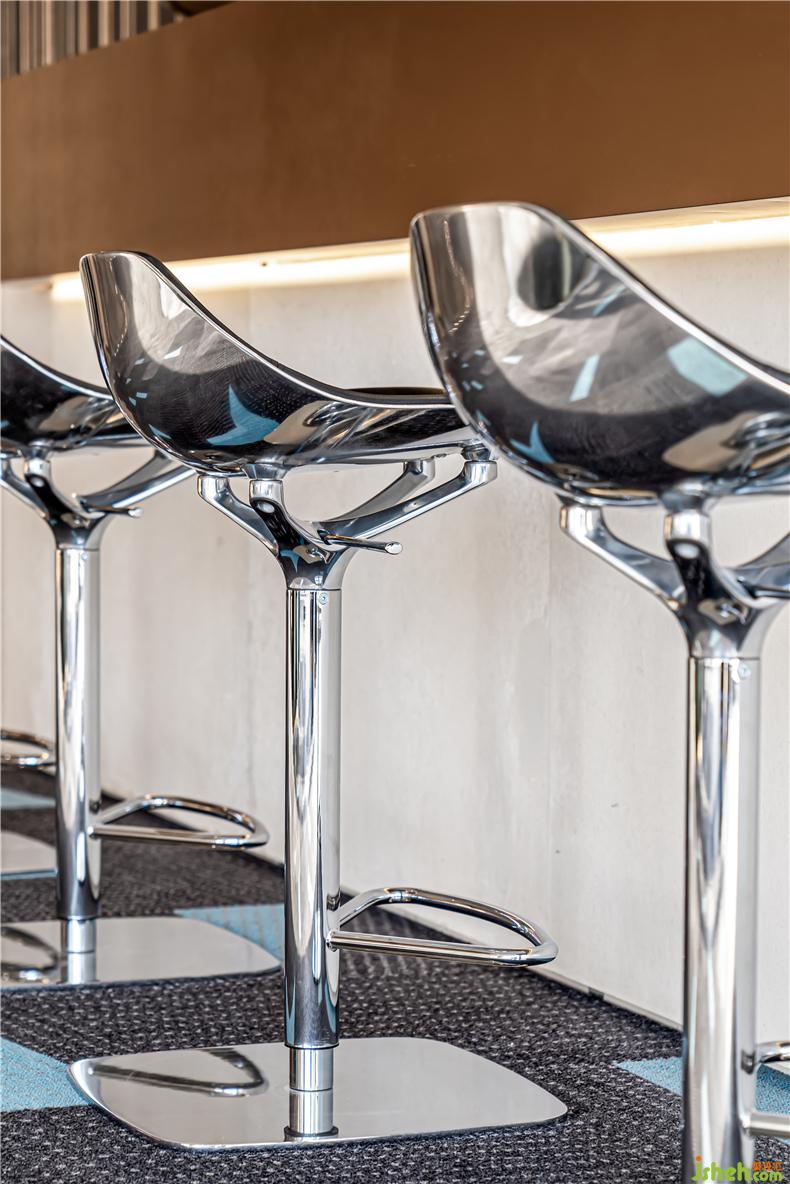 水吧區(qū)垂掛的一組TOMDIXON的TOP Silver Pendant燈具,精致而優(yōu)雅,是材料與制造工藝的創(chuàng)新之舉。微穿孔燈罩如細(xì)膩的濾網(wǎng)拋光不銹鋼表面通透明亮,散發(fā)出陣陣溫暖的光芒,輕盈空靈。不銹鋼的質(zhì)地與羅斯堡RocheBobois的銀色不銹鋼椅相得益彰,造型簡潔卻質(zhì)感十足,時(shí)尚與前衛(wèi)的設(shè)計(jì),彰顯不凡格調(diào)。