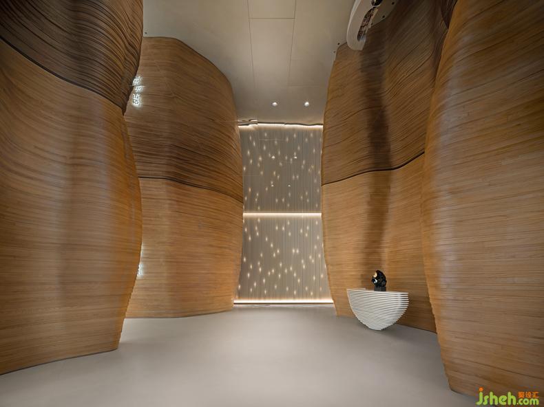 售樓中心設(shè)計(jì)不是一種技能,而是捕捉事物本質(zhì)的感覺能力和洞察能力。接待區(qū)以山川峽谷為形,流動(dòng)光影為意,橫是層巒疊嶂,縱是深林幽靜。峽谷盤旋而上,用曲線構(gòu)建了一個(gè)舞臺(tái),變幻于虛幻與現(xiàn)實(shí)間,沉浸于行云流水般的空間中翩翩起舞,美學(xué)與自然形成了強(qiáng)烈的互動(dòng)與完美的融合。