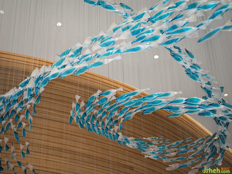 沙盤區(qū)將「未來」與「自然生態(tài)」兩種形態(tài)結(jié)合到一起,裝修設(shè)計(jì)并以此一動(dòng)一靜的情景作為設(shè)計(jì)思考的方向。流動(dòng)而有序的層次構(gòu)造,宛如深而舒緩的藍(lán)色絲帶,蜿蜒綿亙?cè)谏潮P上方。讓人仿佛踩在河床。在淺色陰影中,在閃閃發(fā)光的表面中,在深深的平靜中,同是在無盡的溪流中。