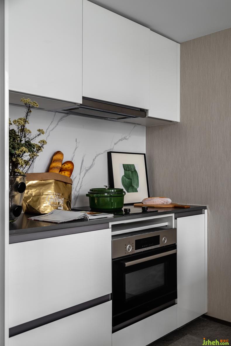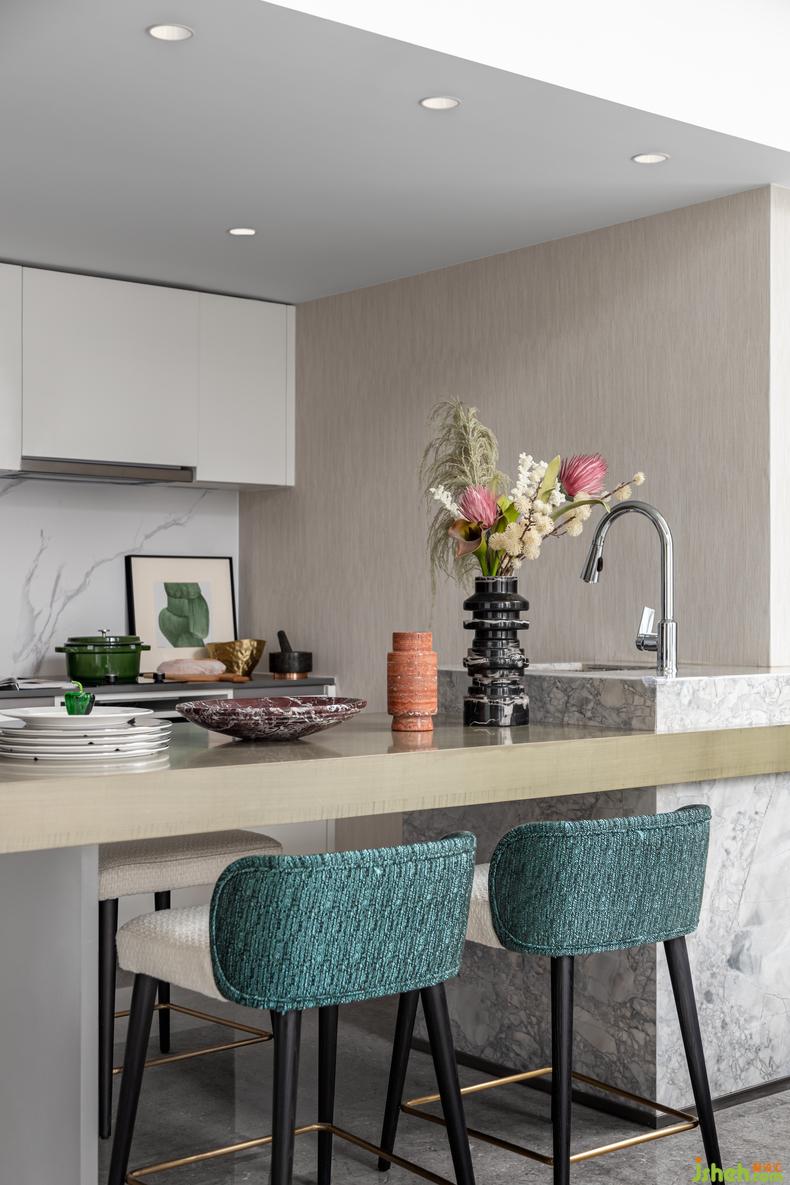 餐廚空間以簡(jiǎn)約之風(fēng)構(gòu)造出別具一格的舒適體驗(yàn)樣板房設(shè)計(jì)。開放式廚房將吧臺(tái)與廚房結(jié)合,最大化節(jié)省空間的同時(shí)做到擴(kuò)大空間感,增大客廳效果。幾點(diǎn)翠綠穿插交疊,花束生動(dòng)十足,溫馨自然的雅韻之氣在空間蜿蜒綿亙。