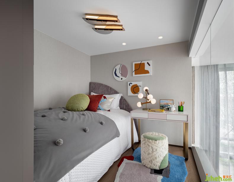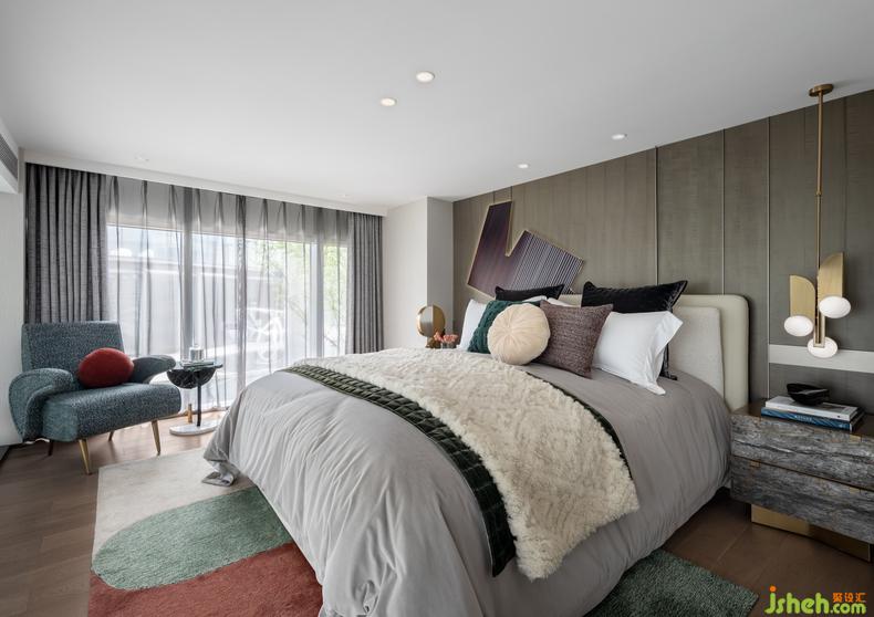 以撞色幾何地毯點(diǎn)綴的主臥空間層次感十足,從實(shí)用的角度到超載的發(fā)揮共同構(gòu)成藝術(shù)的主體。