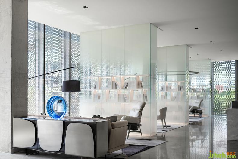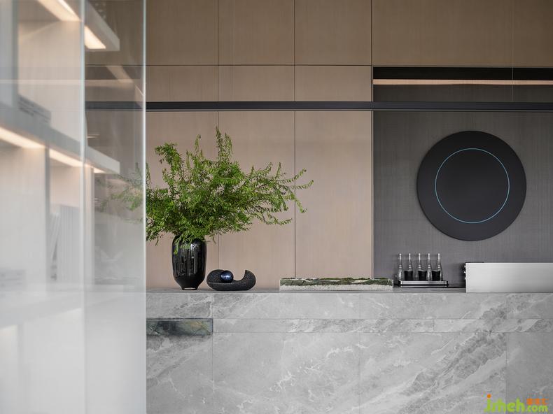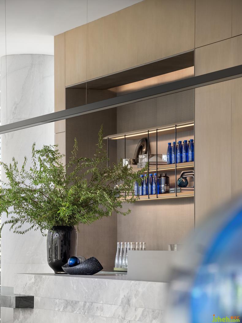 將自然寫進(jìn)生活,一切為提前上演未來生活而服務(wù)。水吧區(qū)的藝術(shù)裝置品《破·曉》將現(xiàn)代與未來相連結(jié),靜謐的藍(lán)宛如沖破時(shí)間縫隙的光,初始熹微,繼而透亮。色彩運(yùn)用干凈利落,空間氛圍在和諧中體現(xiàn)統(tǒng)一。