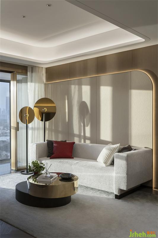 弧形與線條勾勒出別開生面的藝術(shù)之境,金屬元素的搭配豐富了空間美學(xué)。木質(zhì)色彩溫潤簡雅,柔和溫暖,頗具情調(diào)的光線透過鏡面反射,樣板房設(shè)計燈光暈染在墻壁上,散出幾分寧靜氣息