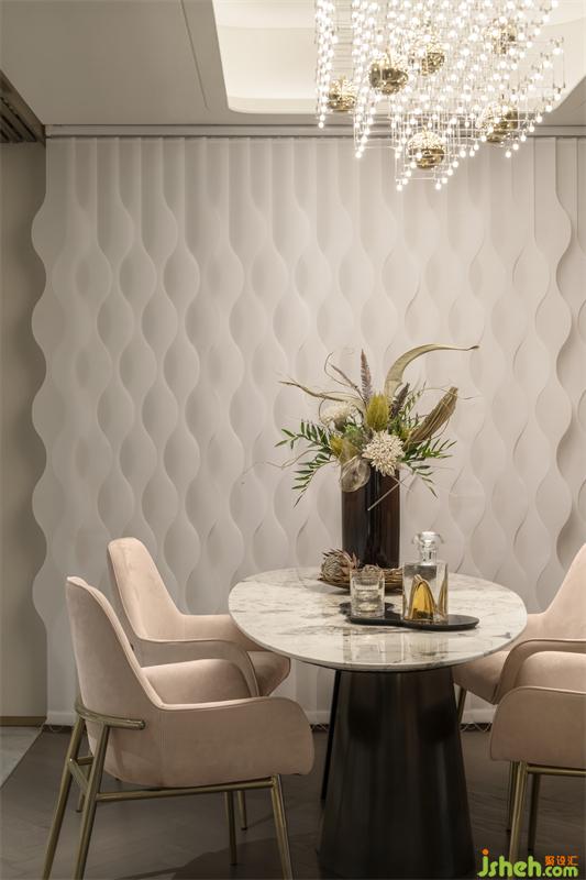 規(guī)整的收納、流暢的動線,不拘泥于餐廚的用途所在,而是將美感延伸開來??臻g藝術(shù)主燈宛如點點繁星散落,流動的藝術(shù)在變換間被注入情感色彩,讓家有了詩意和溫度。