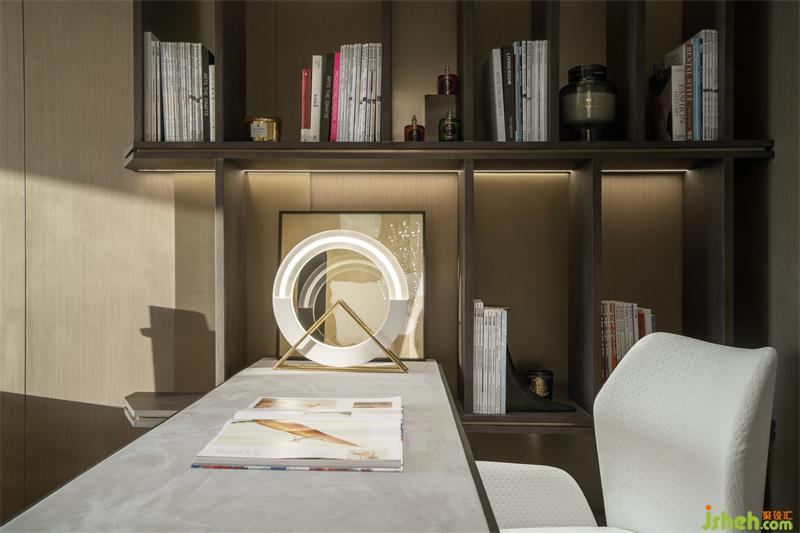 擺畫布景,壁架置物,書房空間處處可觀詩意芳華。無論是伏案工作,亦或是休息閱讀,書架的書籍散發(fā)出強烈的秩序感,靜謐的環(huán)境總能增添更多的空間美學(xué)