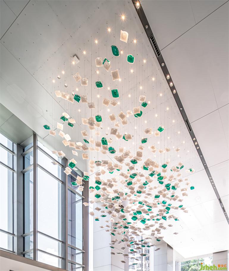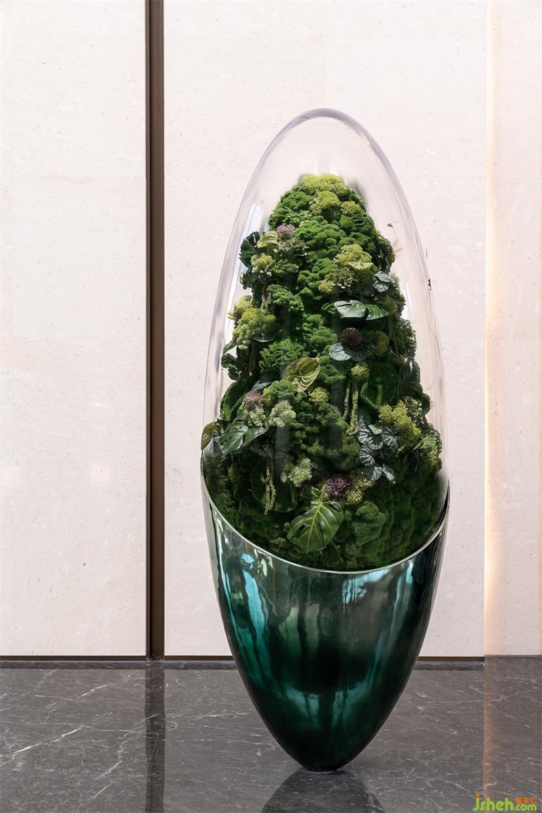 接待臺基底規(guī)整的大理石具有沉穩(wěn)理性的氣質格調(diào),以一顆結合了當代科技的種子作為穿越時間的容器,造中糧·大悅城的理想之國。