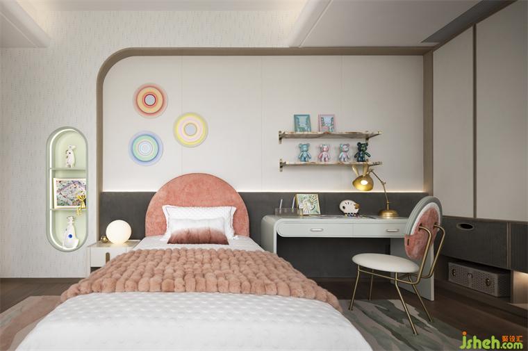 兒童房以藕粉色調(diào)勾勒恬靜的氛圍空間,在此夢(mèng)幻的小世界里,樣板房設(shè)計(jì)承載了小主人繪畫(huà)、娛樂(lè)、學(xué)習(xí)等需求,居者的藏品規(guī)整且自由地靜置于展架之上,靈動(dòng)而不失童趣,是興趣的陶冶,也是對(duì)世界的好奇與探索。