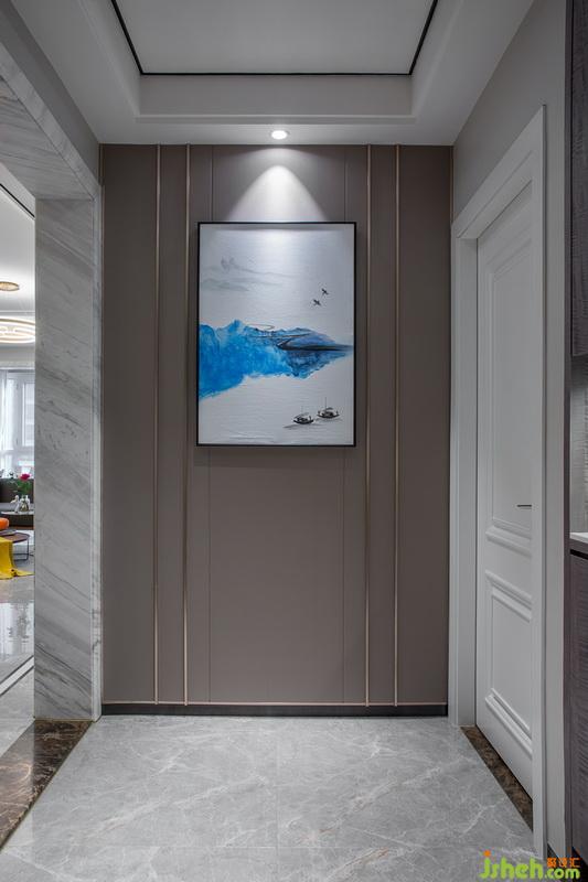 過道采用黑白灰搭配簡約線條,營造出簡潔而現(xiàn)代的空間感受,山水畫勾勒表現(xiàn)的意境和格調(diào)呈現(xiàn)出一種寧靜致遠(yuǎn)的感覺。