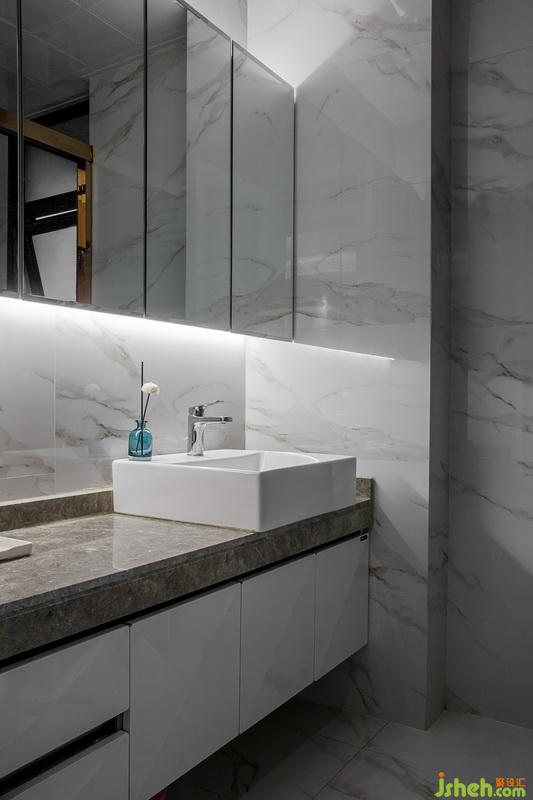 在公衛(wèi)的設(shè)計(jì)上,室內(nèi)設(shè)計(jì)師全部采用大理石臺(tái)面,用簡單的白色墻磚搭配灰色臺(tái)面,使得空間更加穩(wěn)重簡潔。鏡柜加不銹鋼地柜的設(shè)計(jì)完美收納所有雜物和化妝品。