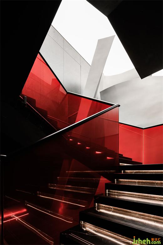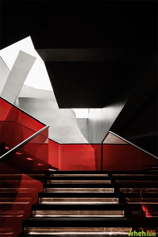 The cavernous entrance is conceived as a time tunnel, evoking the iconic information flow scenes from the classic sci-fi film2001: A Space Odyssey. On the dark, smooth surface, the reflection of the red neon curve breaks, scattering into points, and creating a blurred and ambiguous ambiance.