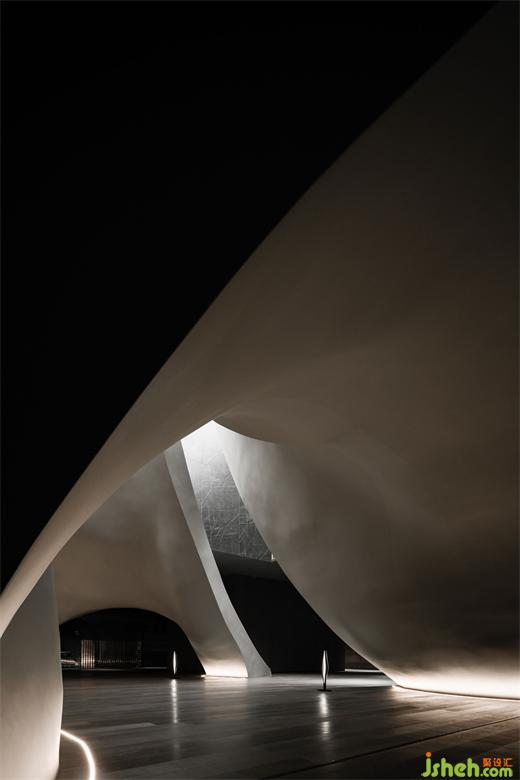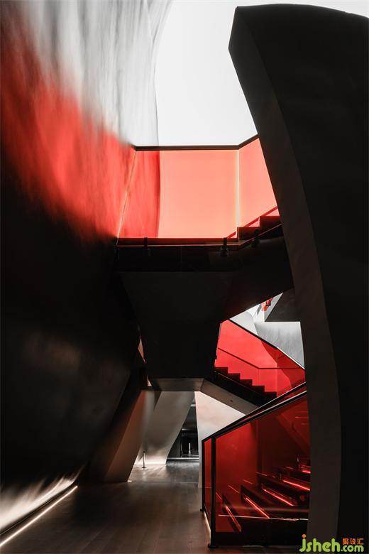 涵洞般的入口被設(shè)計(jì)為一條時(shí)光隧道,讓人想起經(jīng)典科幻電影《2001太空漫游》中的信息流場(chǎng)景。展廳設(shè)計(jì)漆黑光滑的表面上,反射著地面上紅色霓虹曲線的散碎光點(diǎn),模糊曖昧。