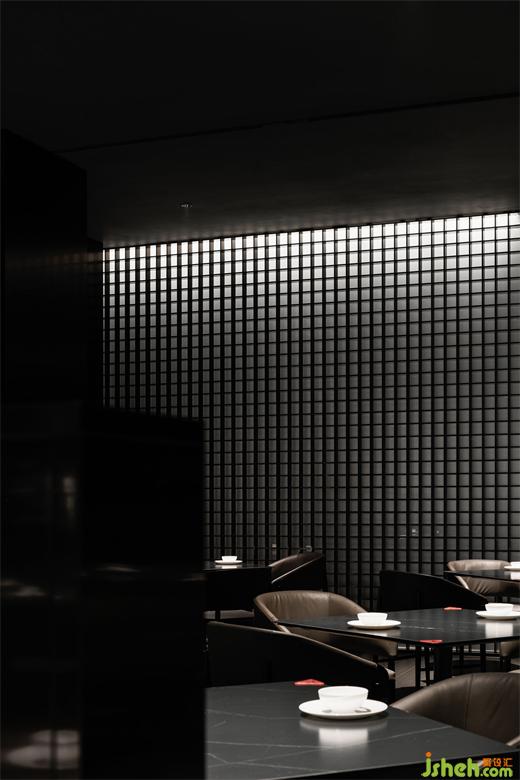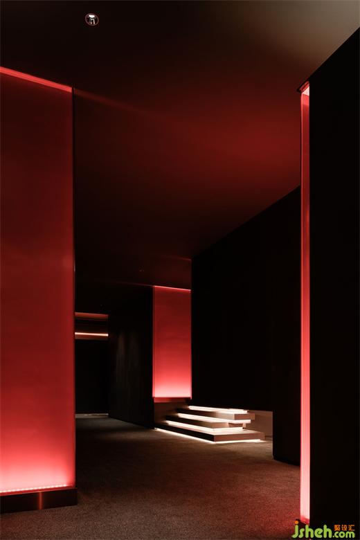 The grey-black toned texture and simple linear forms naturally evoke the atmosphere of old Shanghai photographs. Turquoise pool water and crimson glass, like vintage wine, infuse the surroundings with intoxicating reflections. Briefly pause, ascend the steps, and make a splendid entrance.
