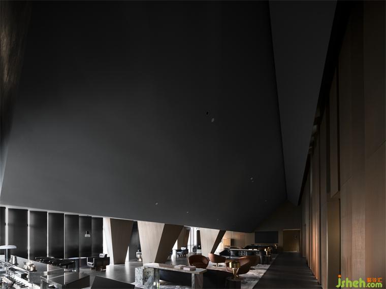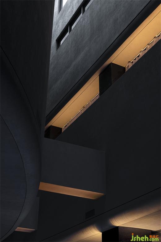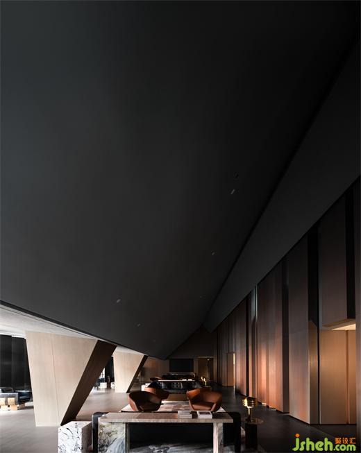 在“巖壁”造型與有機(jī)的弧形墻面以及上層玻璃幕墻之間,產(chǎn)生了大小不一、形態(tài)迥異的垂直縫隙。度假酒店設(shè)計柔和的自然光線傾灑其間,微妙的內(nèi)嵌燈帶氤氳其里。在大廳緩緩漫步,仿佛置身于詹姆斯·特瑞爾的光影藝術(shù)作品中。
