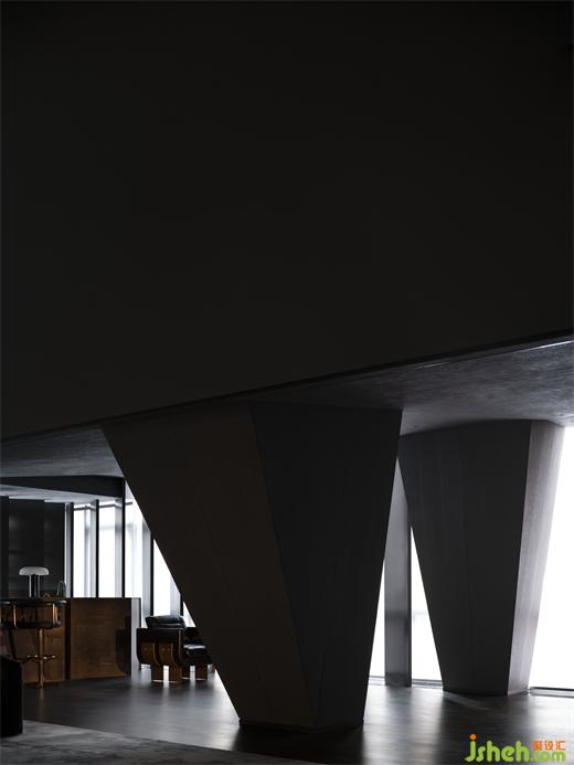 沿著酒店空曠的大廳行進(jìn),梁結(jié)構(gòu)投下的陰影歷歷可數(shù)。倏爾,紀(jì)念碑式的混凝土圓筒結(jié)構(gòu)與玻璃電梯并峙,漫長而嚴(yán)肅的高塔盡頭是天窗里的白云藍(lán)天。與大廳幾何化的“巖壁”一樣,這樣的“人工化”的界面會同時帶來抽離感和安定感,不經(jīng)意間引導(dǎo)人的運動與靜駐。