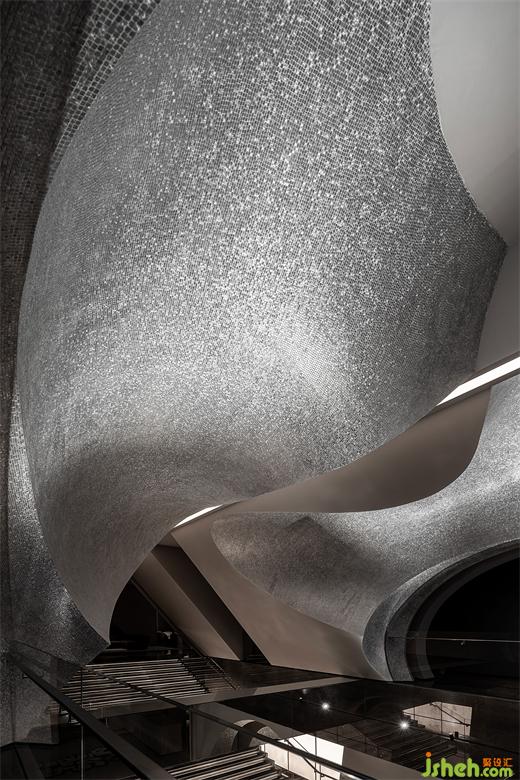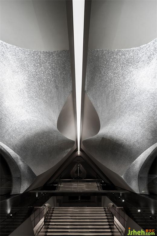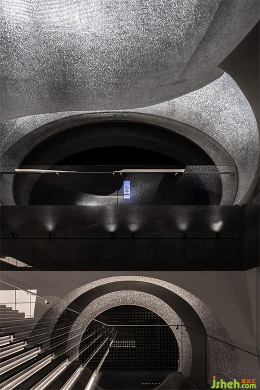 宏大的巨型雕塑式對稱空間和幽暗基調(diào),是心靈之旅的序曲。天花如水流般蜿蜒,弧形墻面包裹出一座內(nèi)建筑。光線在馬賽克表面反射出不同的色彩和質(zhì)感,傳統(tǒng)手工藝與現(xiàn)代建筑在此相遇。