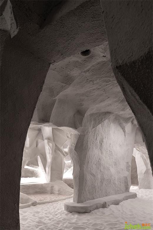 塊面感的巖石肌理寫意出洞穴般的原始質(zhì)感和粗曠力量。慢射的光線溫柔地?fù)嵊|著巖壁。洞穴曲線和陰影交織出深邃而古遠(yuǎn)的氛圍,仿佛穿越遠(yuǎn)古時代的神秘圣地。腳尖踏入沙礫的一瞬,集體無意識被喚醒。時間在此刻停滯,與天地融為一體。