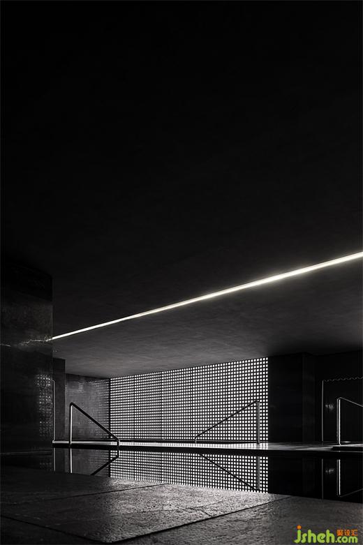 上海洗浴設(shè)計天花板上的細(xì)長光帶與纖細(xì)的金屬扶手彼此呼應(yīng),現(xiàn)代感與理性美構(gòu)成一幅極簡主義畫作。平靜的水面仿佛一面通向未知世界的鏡子,訴說著時間的流逝與永恒。幽暗的空間傳遞出生活哲理與情感共鳴。