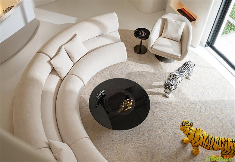 走進(jìn)沙發(fā)區(qū)域,你也許會發(fā)現(xiàn),腳下的地毯模擬著老虎皮毛的色澤與紋路。從酒柜中拿出威士忌,倒上一杯后放入面前的可開合式茶幾中,點上雪茄,沉浸式獨享片刻的休閑時光。