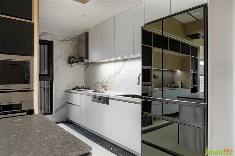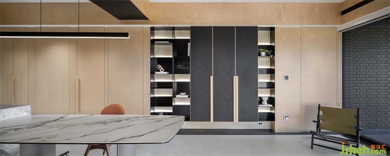 通過餐廳往客廳移動,在進入客廳前的一方天地,家居設(shè)計利用樺木設(shè)計了書柜,配合旋轉(zhuǎn)電視柜的石材臺面,此機能上也兼具多重作用,電視高低錯落的臺面既可充當(dāng)兒童游戲的臺面使用,也可當(dāng)座位區(qū)。悠閑并開放感十足的窗邊閱讀區(qū),恣意隨性。