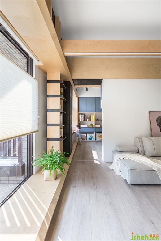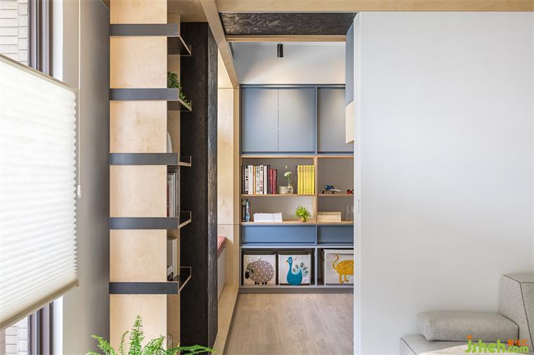 來(lái)到客廳后方原有客房,設(shè)計(jì)團(tuán)隊(duì)將部分墻面拆除,改以透光門片代替。業(yè)主在廚房備餐的時(shí)候,視覺(jué)可以穿透到開(kāi)放的客廳與游戲房空間,以確保孩童的安全。游戲室一面?zhèn)葔υO(shè)有整面的收納柜,柜體下方留有開(kāi)放層板,將孩童喜愛(ài)的玩具箱放置于適合他們身高的位置,方便他們學(xué)習(xí)自行收納的好習(xí)慣。游戲房另一側(cè)墻面則是配置上柜,下方可以放置活動(dòng)書(shū)桌,將來(lái)可輕易變化成孩童們的書(shū)房,必要時(shí)也能將兩側(cè)滑門關(guān)上,幫助孩童專心于課業(yè)。彈性的調(diào)配空間,使游戲房可以跟隨小主人一同成長(zhǎng)進(jìn)化,比起設(shè)于固定單一使用客房更利于其使用價(jià)值。