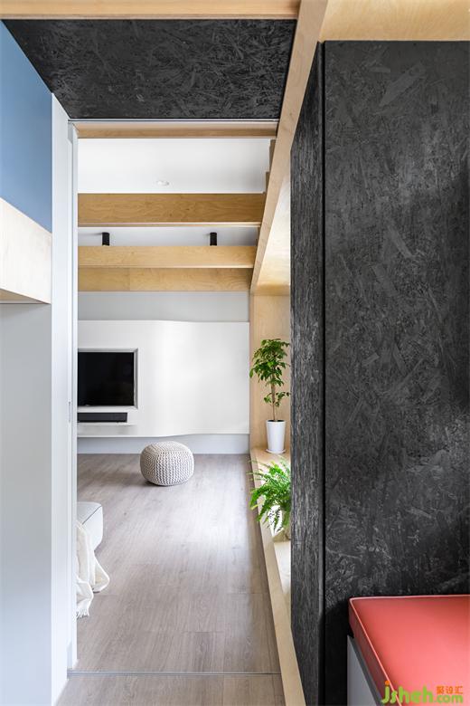 本住宅擁有良好屋高,天花板有趣的設(shè)計(jì)也是本案設(shè)計(jì)的另一大亮點(diǎn)。打斜的天花板實(shí)際上是仿歐式小木屋,豪宅設(shè)計(jì)團(tuán)隊(duì)巧妙的將吊隱式的冷氣機(jī)子隱藏于天花上方,只降低局部天花,并從墻面延續(xù)木屋的直線型木板至天花,色彩上也利用墻面上半部的灰色帶到斜天花,視覺(jué)上間接提升了天花的高度。兩種色調(diào)墻面的后方備有一個(gè)儲(chǔ)藏室,滿足收納大型推車的需求?,F(xiàn)況的兩支上梁橫跨客餐廳與游戲室,設(shè)計(jì)團(tuán)隊(duì)不但不將梁隱藏,還做了另外兩條木作橫梁做為裝飾,延續(xù)歐式木屋的橫梁結(jié)構(gòu)特性,將這三個(gè)開(kāi)放空間串聯(lián)起來(lái)。木作橫梁內(nèi)藏LED間接照明,讓光反射到平天花,顯得空間更為輕盈。因應(yīng)廚房和餐廳的實(shí)用性質(zhì),地板材質(zhì)使用六角銀狐磁磚,從玄關(guān)一字形延伸到廚房,也與上方斜天花的邊界相呼應(yīng),巧妙區(qū)分空間性質(zhì)。餐桌上方配置有不規(guī)則垂吊燈,加入黑色元素,與客廳木窗框上方有著一樣的反差色系,給與視覺(jué)上極簡(jiǎn),又帶有濃烈對(duì)比的立體效果,符合業(yè)主所期待的現(xiàn)代洗斂的北歐氛圍。