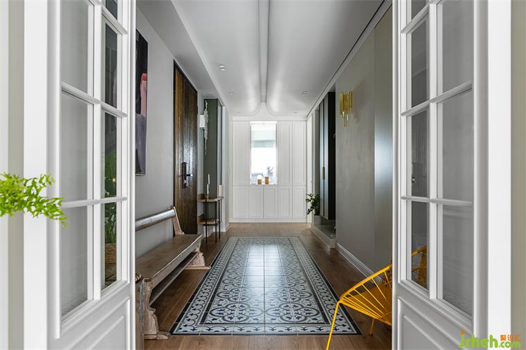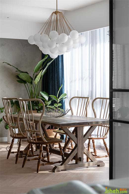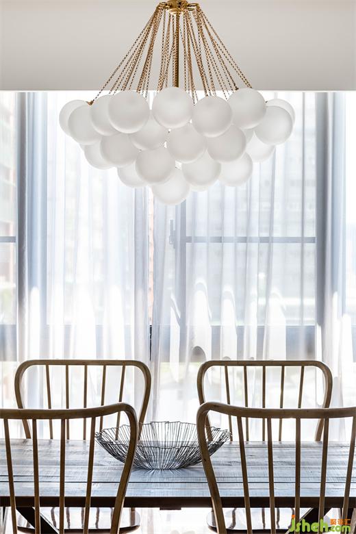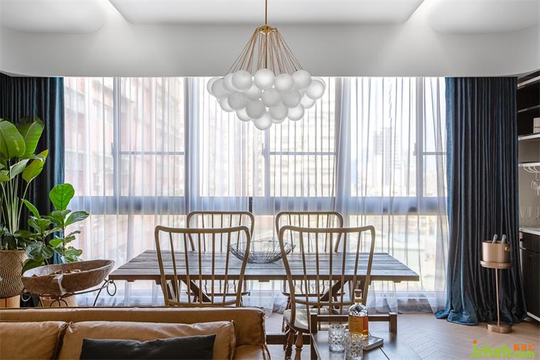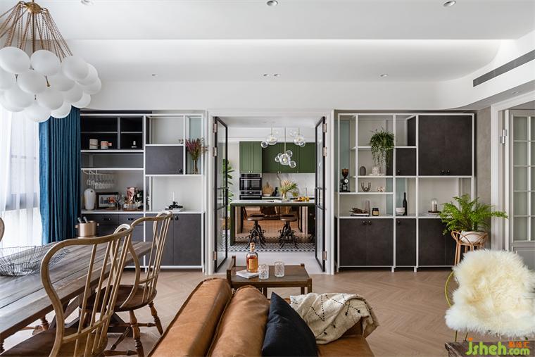 由玄關(guān)進(jìn)入到客廳,再由餐廳進(jìn)入到廚房空間,皆使用雙推門方式,搭配男屋主喜愛的黑白灰做為全屋基本配色,餐廳區(qū)塊使用橄欖綠當(dāng)作跳色,金屬色的吊燈系列,營造室內(nèi)慵懶優(yōu)雅輕奢華基調(diào)。現(xiàn)代感強(qiáng)烈的圓弧造型天花從進(jìn)門玄關(guān)開始,一路延伸到公領(lǐng)域,豪宅設(shè)計(jì)柔和的弧形與空間的線條感強(qiáng)烈的古典相互調(diào)和,佐以窗邊灑進(jìn)充沛采光,讓黑白灰也能很有溫度!