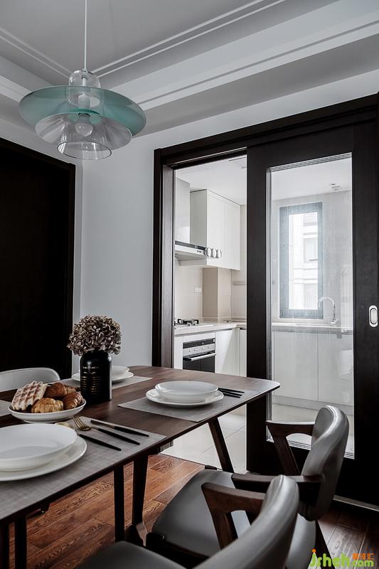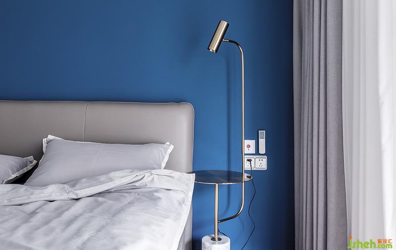 ▲書桌的面是一整塊胡桃木桌面,黑色的工業(yè)風(fēng)裝飾帽子燈和臺(tái)燈,在藍(lán)色墻面漆下自然活波起來。