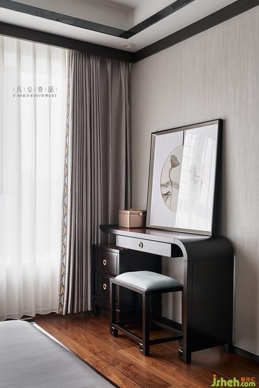 臥室的淺色調(diào)搭配家具莫蘭迪色系的軟包,墻壁為定制古韻壁畫,地板為天然黑胡桃木、豐富的色彩插入點綴了煙灰的空間,細膩處從容儒雅。