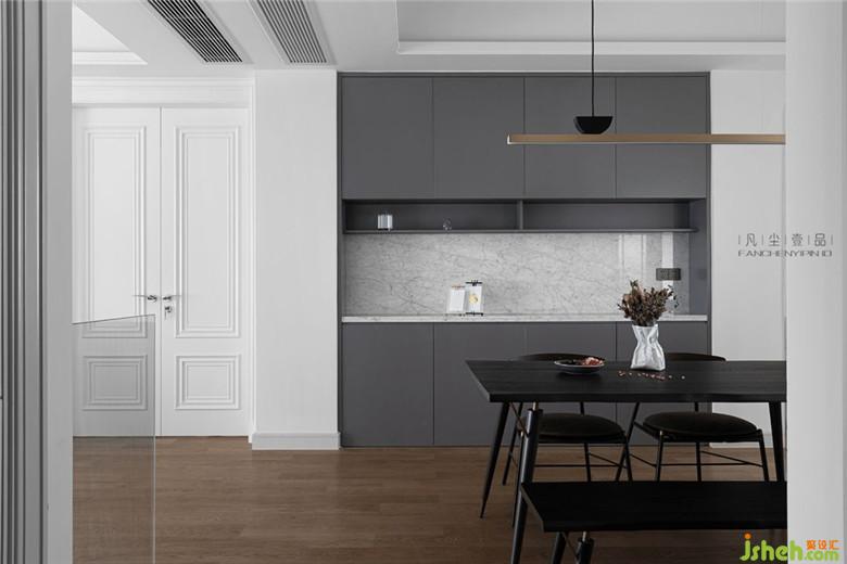 餐廳的中島+餐廳組合,利用原本就狹長(zhǎng)的餐廳空間,設(shè)計(jì)一體式內(nèi)嵌烤箱和廚衛(wèi)電器組合,解決廚房空間無法再增加這些功能的現(xiàn)實(shí)問題。
