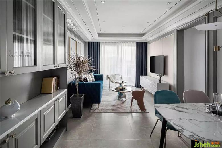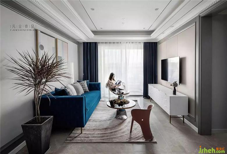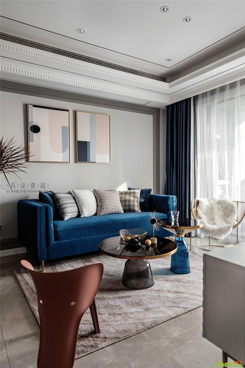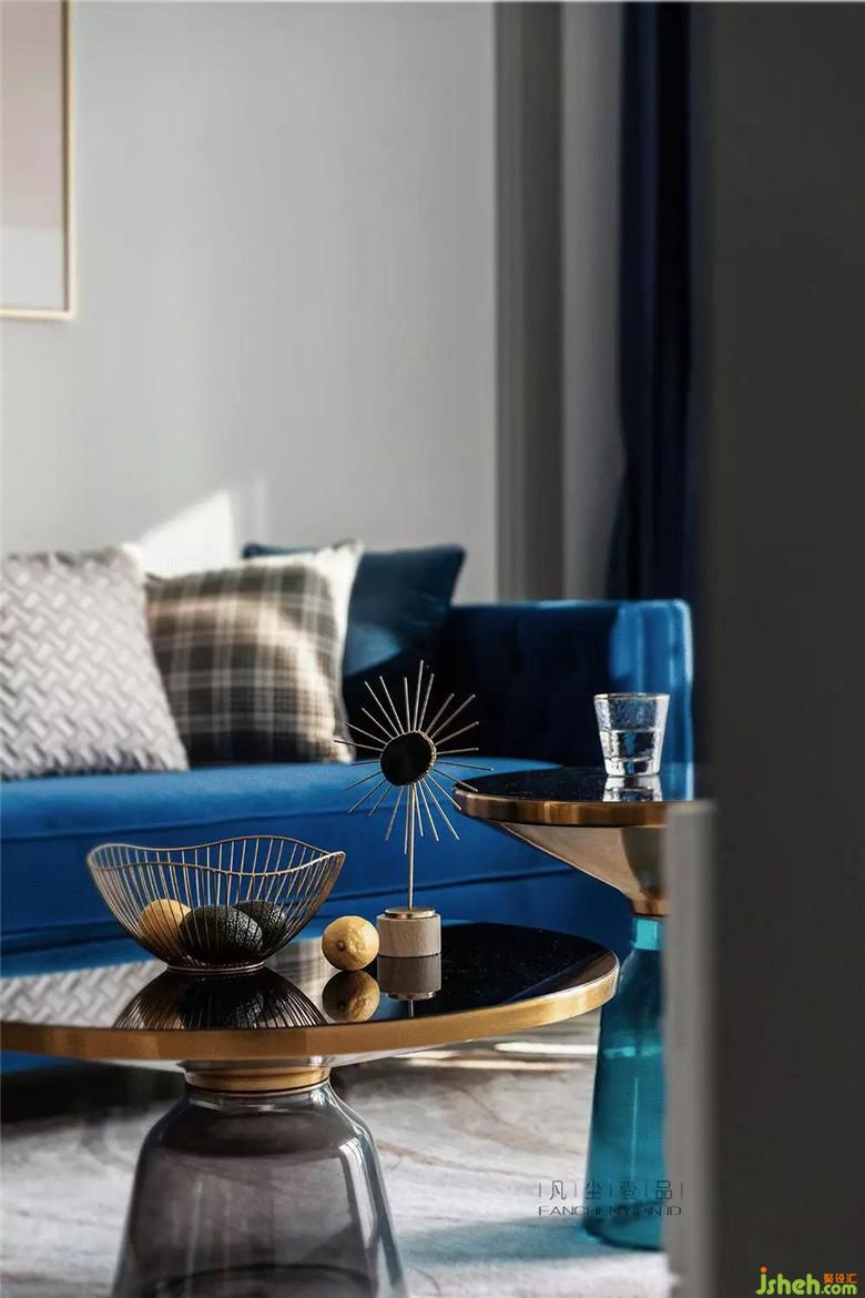 天鵝絨材質(zhì)沙發(fā),細膩的觸感搭配金屬鑲邊玻璃茶幾,讓客廳空間氛圍透出輕奢的氣味,經(jīng)典藍主色調(diào)貫穿其中,在不同材質(zhì)上表現(xiàn),絲絲相扣。