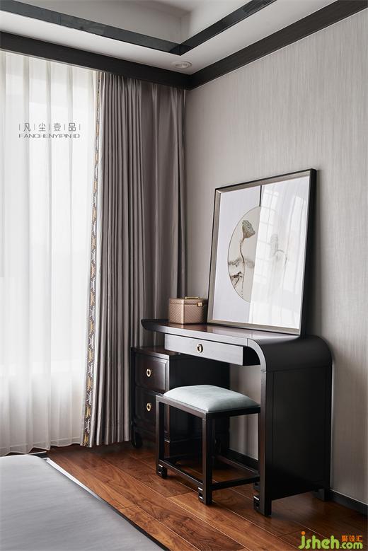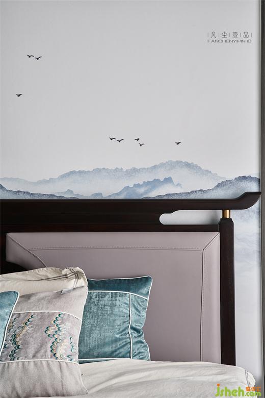 臥室的淺色調(diào)搭配家具莫蘭迪色系的軟包,墻壁為定制古韻壁畫(huà),地板為天然黑胡桃木、豐富的色彩插入點(diǎn)綴了煙灰的空間,杭州臨安燕東園別墅裝修設(shè)計(jì)細(xì)膩處從容儒雅 。