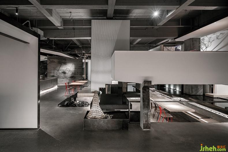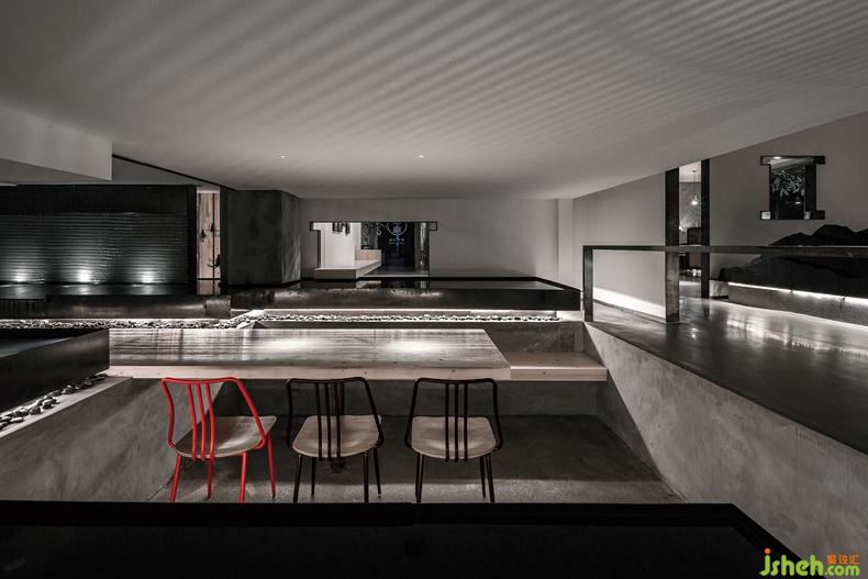 位于空間正中心的水景臺,以景觀的固定性以及水本身的流動性,一方面雕琢著開放式空間的邊界,另一方面又如同餐廳的動脈,借潺潺流水賦予整個空間生命的活力。