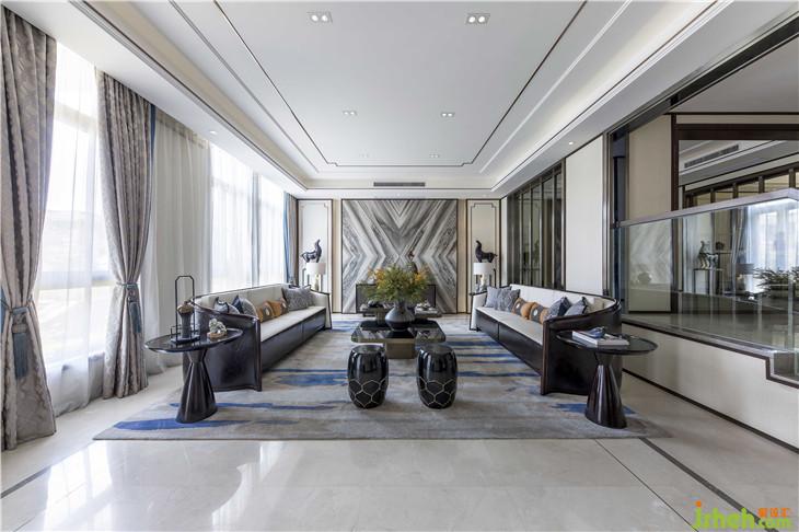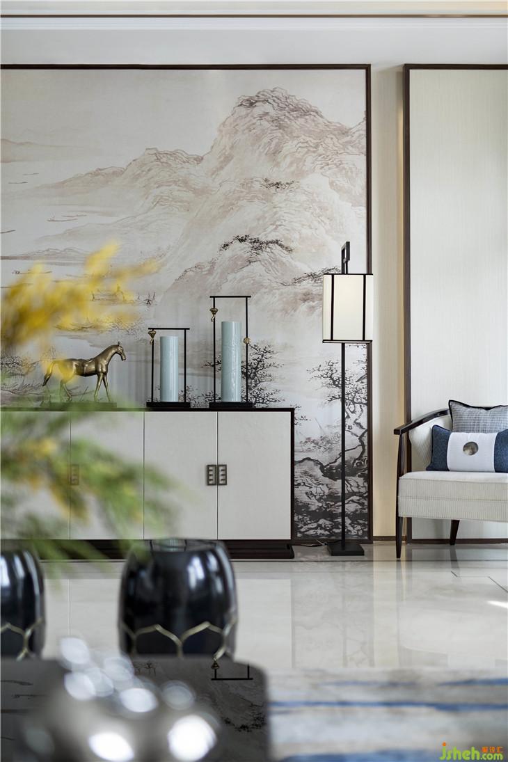 客廳空間清朗開闊,左右通透的玻璃窗,簡(jiǎn)練的布置和精美的裝飾,讓人有賓至如歸之感。入口門廳處,背景墻為一幅極為清雋的人文山水畫卷圖,近乎白描的線條,抒寫著山水悠然意境,讓自然情趣在空間自然彌漫,兩側(cè)放置簡(jiǎn)雅的新中式地?zé)?、圈椅,將《宋史》中所提及的“耳目清曠,不設(shè)機(jī)關(guān)以待人,心安閑而體舒放”的自在感納入空間。