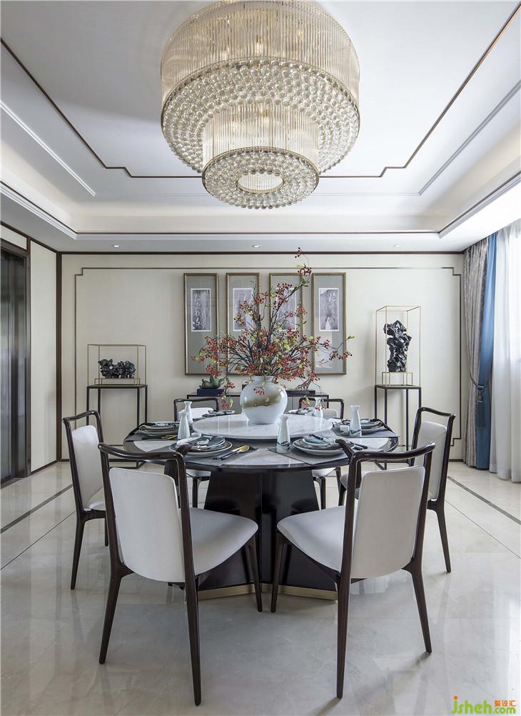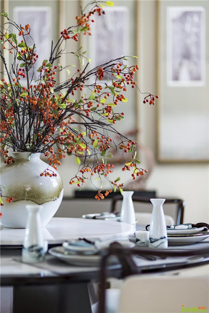 簡(jiǎn)約的空間形制,給予人一種回歸自然、俯仰自得的圓融自在感,傳統(tǒng)而溫馨的圓桌,中式白瓷搭配肆意生長(zhǎng)的枝椏、紅果,別有一番鮮麗動(dòng)人的意韻,居住的詩(shī)意成了餐桌上一小片風(fēng)景。