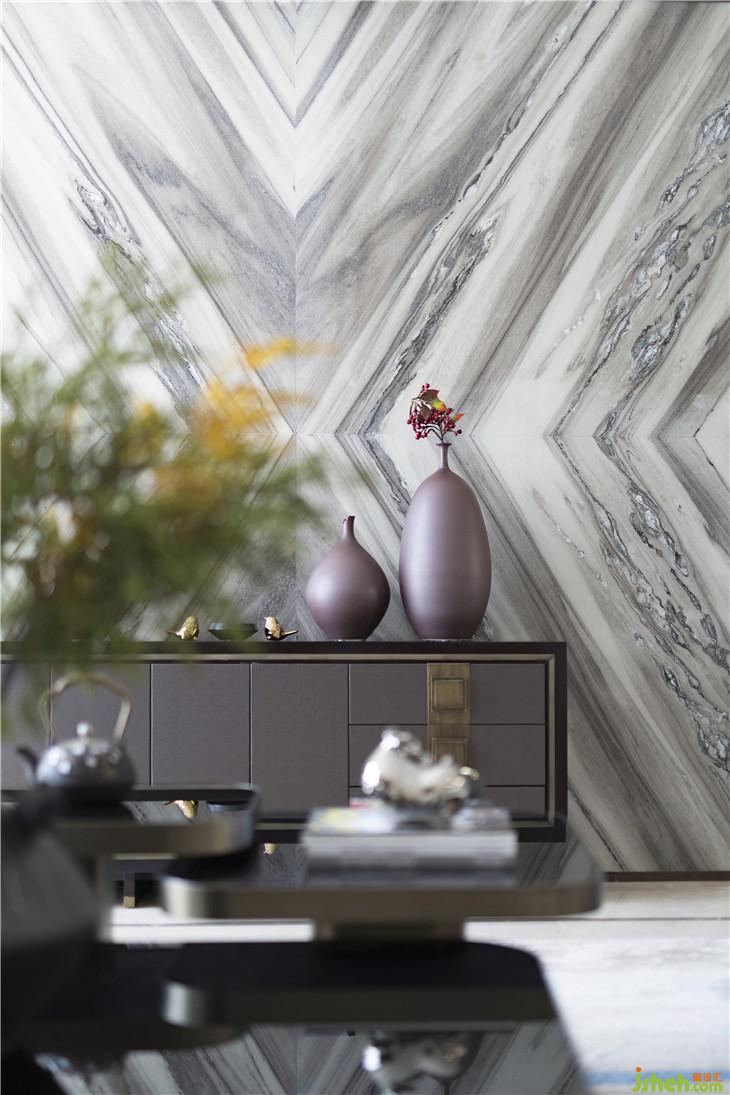 設(shè)計(jì)將重慶起伏蜿蜒、層層臺(tái)階元素經(jīng)過提煉,演變成室內(nèi)天花的框線圖案,現(xiàn)代材質(zhì)的拼接茶幾同樣呈現(xiàn)出高低起伏的樣態(tài)。文雅的文人風(fēng)情和宜居的現(xiàn)代中式情調(diào)彌漫空間,設(shè)計(jì)在色彩上調(diào)配出傳統(tǒng)的情韻,結(jié)合形制簡(jiǎn)約、中西結(jié)合的家具,倍顯清雅安然,軟裝配飾的選擇上則以富含中式元素的靠枕、花藝、小品增添空間情韻。