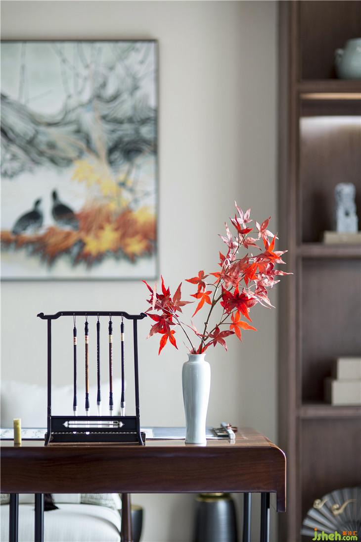 中式風(fēng)格的空間,自然流露出一種經(jīng)久不息的古典氣質(zhì),以高潔素雅為尚。在書法室的呈現(xiàn)中,清貴之氣與書卷氣交融?!安灰丝漕伾茫涣羟鍤鉂M乾坤,”元代詩(shī)人王冕的詩(shī)句,洋溢著磊落浩然之氣,也凝煉在這個(gè)空間中。