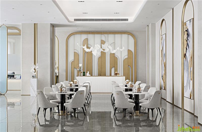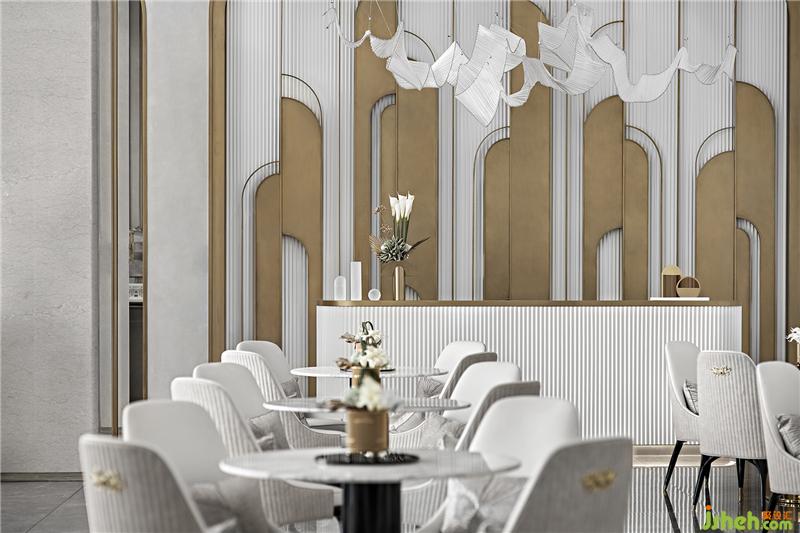 白凈的折線與拱形的金屬形成兩種極致的對白與呼應,設計師以無窮的想象把無意識的行動轉(zhuǎn)化為可見之物,將物體的輪廓用藝術(shù)語言再度改編,理性與感性的交疊與平行中,用設計為售樓中心全新賦能。
