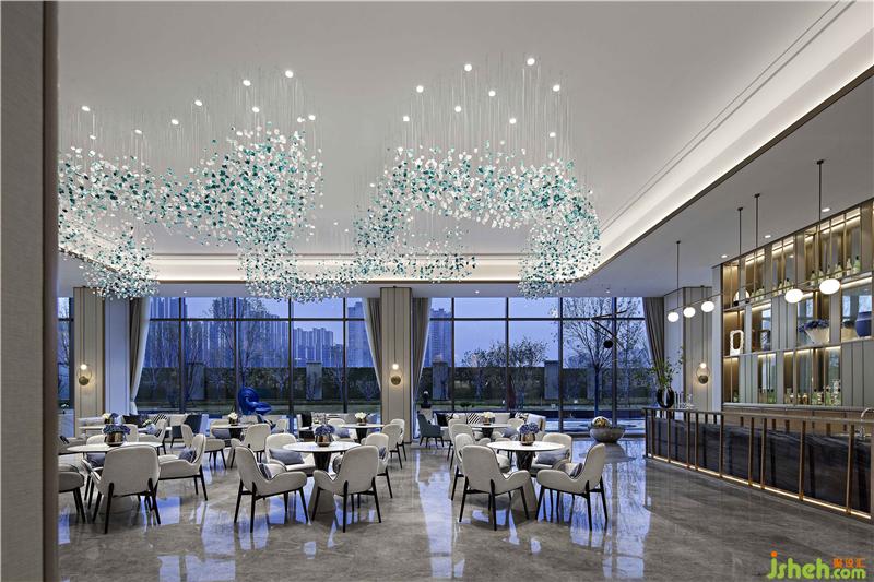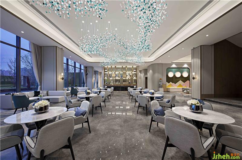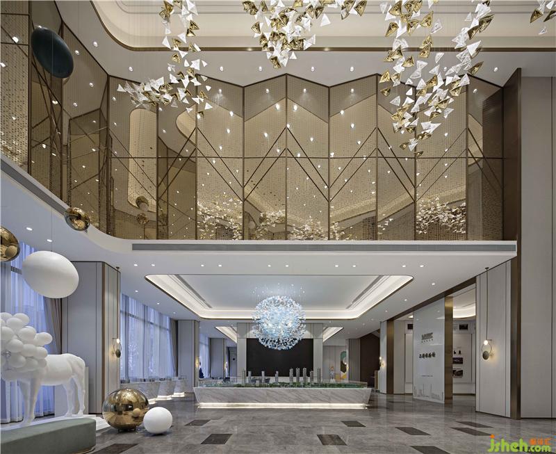 金色與透明相間的幾何水晶吊燈,看似無序?qū)崉t規(guī)律地串聯(lián)起一個(gè)灑脫、未來感十足的現(xiàn)代酷炫空間印象,與接待臺(tái)背景墻燈光、墻面裝飾線條以及接待臺(tái)立面造型的規(guī)律秩序形成視覺上的互補(bǔ),讓觀者不斷地產(chǎn)生期待與驚奇。裝修設(shè)計(jì)
