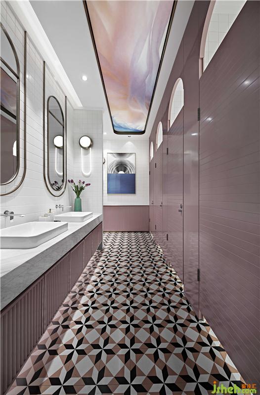 洗手間的折線運(yùn)用達(dá)至高潮,直線、曲線、幾何體...各種形態(tài)的線條共處一室,以線、面、體的綜合形式進(jìn)行空間形態(tài)的表達(dá),從平面到立體自然轉(zhuǎn)化。大面積的純色色塊制造一種強(qiáng)烈的心理震撼力,營(yíng)造張揚(yáng)有力、現(xiàn)代時(shí)尚的空間意境。